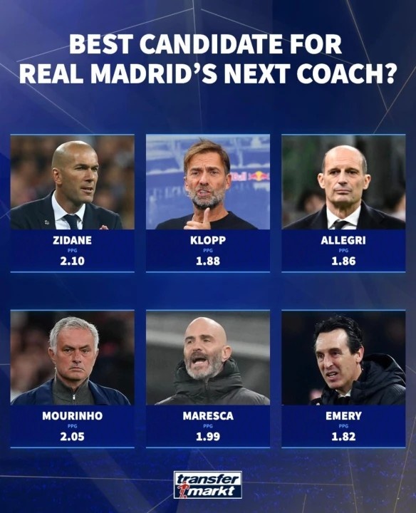 3月5日讯 德转盘点了皇马下一任主帅潜在候选人的执教场均积分,并发问:“谁是皇马新帅最佳人选?”